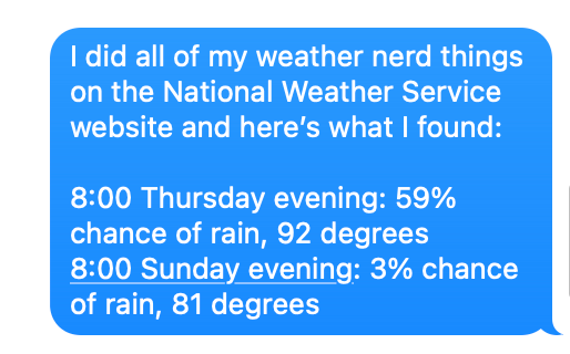That's where I was supposed to be tonight. But a few days ago, when looking at the weather forecast (and looking at whether we'd be leaving Thursday evening or Friday morning), my wife and I called an audible. The weather wasn't looking promising (this theater is 100% outdoors), so I did some research. Here's the text I sent her: