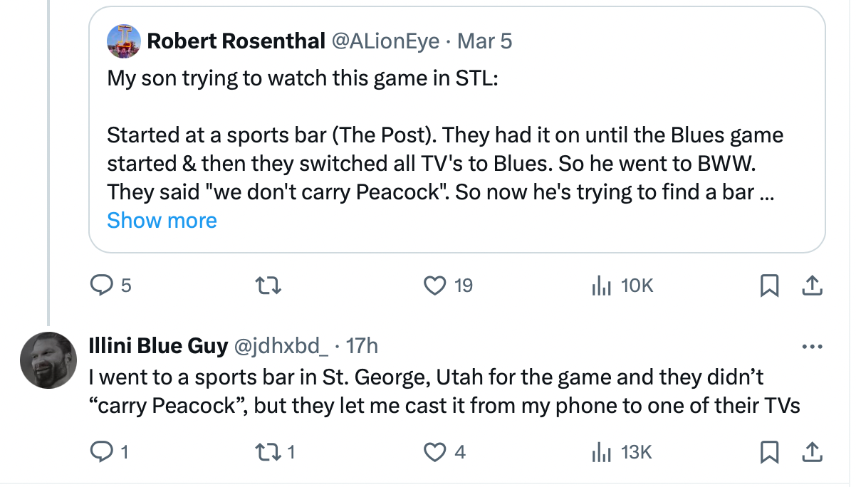 Tuesday night, I noted on Twitter that my son was trying to find the Illinois-Purdue game in St. Louis and struggling to find a sports bar that had it on. The responses went in several different directions, so I wanted to write about what I was trying to say. It wasn't about St. Louis and it wasn't about trying to avoid paying for Peacock. The issue is more... the way we catch the game.