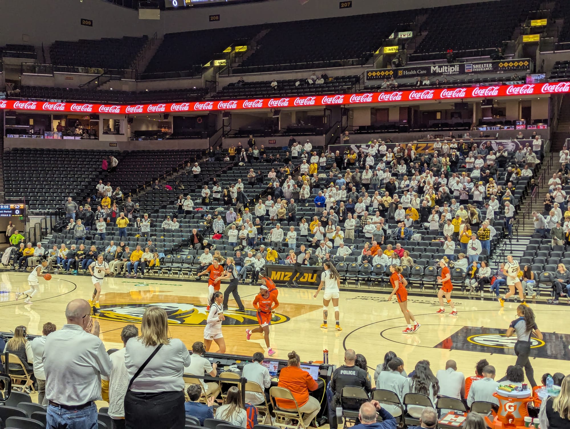 Parking was easy, short walk to the arena, bought a ticket and we're in. I looked for an "Illini section"...best I found was four members of the Rebounders club (drove in from Decatur) about 15 rows up behind our team bench. Probably 15-20 conspicuous Illini fans in the building, though there weren't really THAT many Mizzou fans there either.
