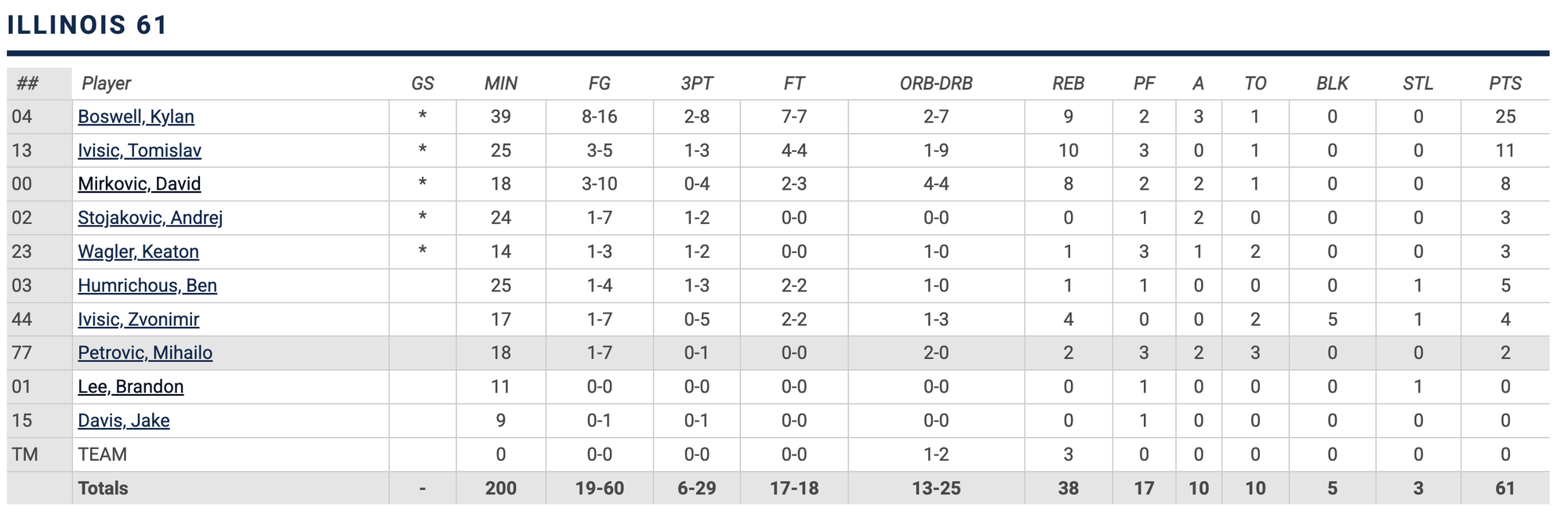 I had this memory of Petrovic having his best game of the year against Connecticut in November, which makes sense: It was the last game before Keaton Wagler fully took over the offense, we couldn't get anything going offensively in that game and turned to Mihailo (only in his fourth game as an Illini) to try to get something going and I remember Petrovic making some funky moves at MSG that provided life to an otherwise lifeless game. So I went back and looked up Petrovic's box score from the Connecticut game: