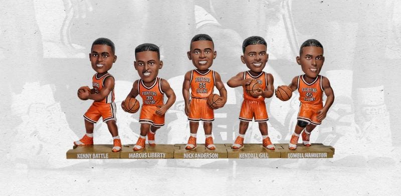 All told: That should be Stephen Bardo instead of Marcus Liberty; reportedly Bardo, always a little bit surly about this sort of stuff (I like this about him), wanted to negotiate more about the use of his likeness, so they went with Liberty. If you were to add a seventh, it's probably Larry Smith or Ervin Small, though I just remembered that Andy Kaufmann was on that team and scored 51 points. He didn't play in any tournament games, though Eddie Manske got in two. (Also, I just learned that Kenny Battle didn't start the Louisville game in the Sweet Sixteen? Wild.) Anyway, there are a clear six bobbleheads here if Bardo would have agreed to it, and while I'd love to make an argument for Tyler, his rights fee is just too high.