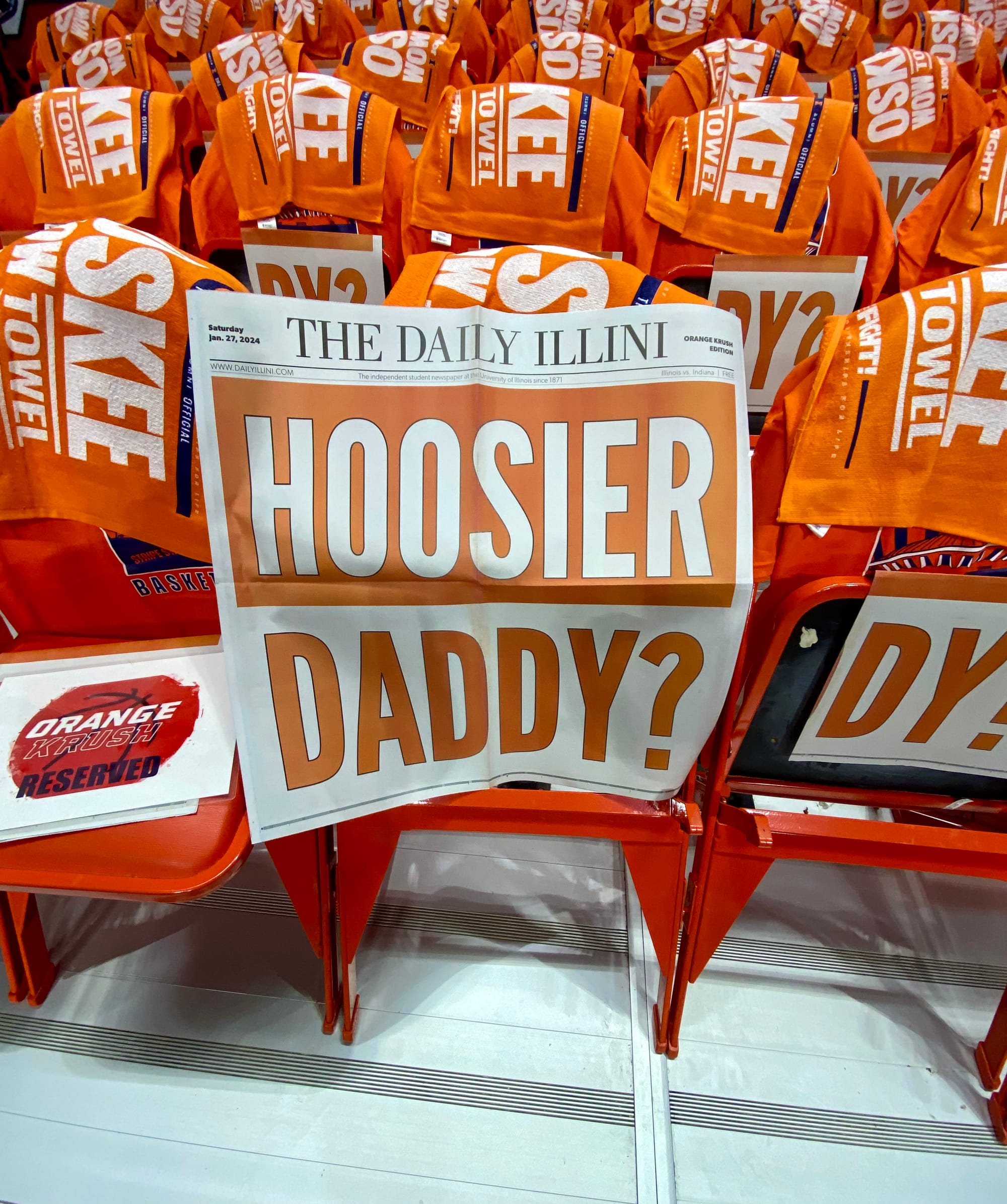 The outside doors have apparently opened as the Orange Krush starts streaming into the building to fill in the section directly behind press row. Their newspaper headlines for this afternoon: “Hoosier Daddy?”