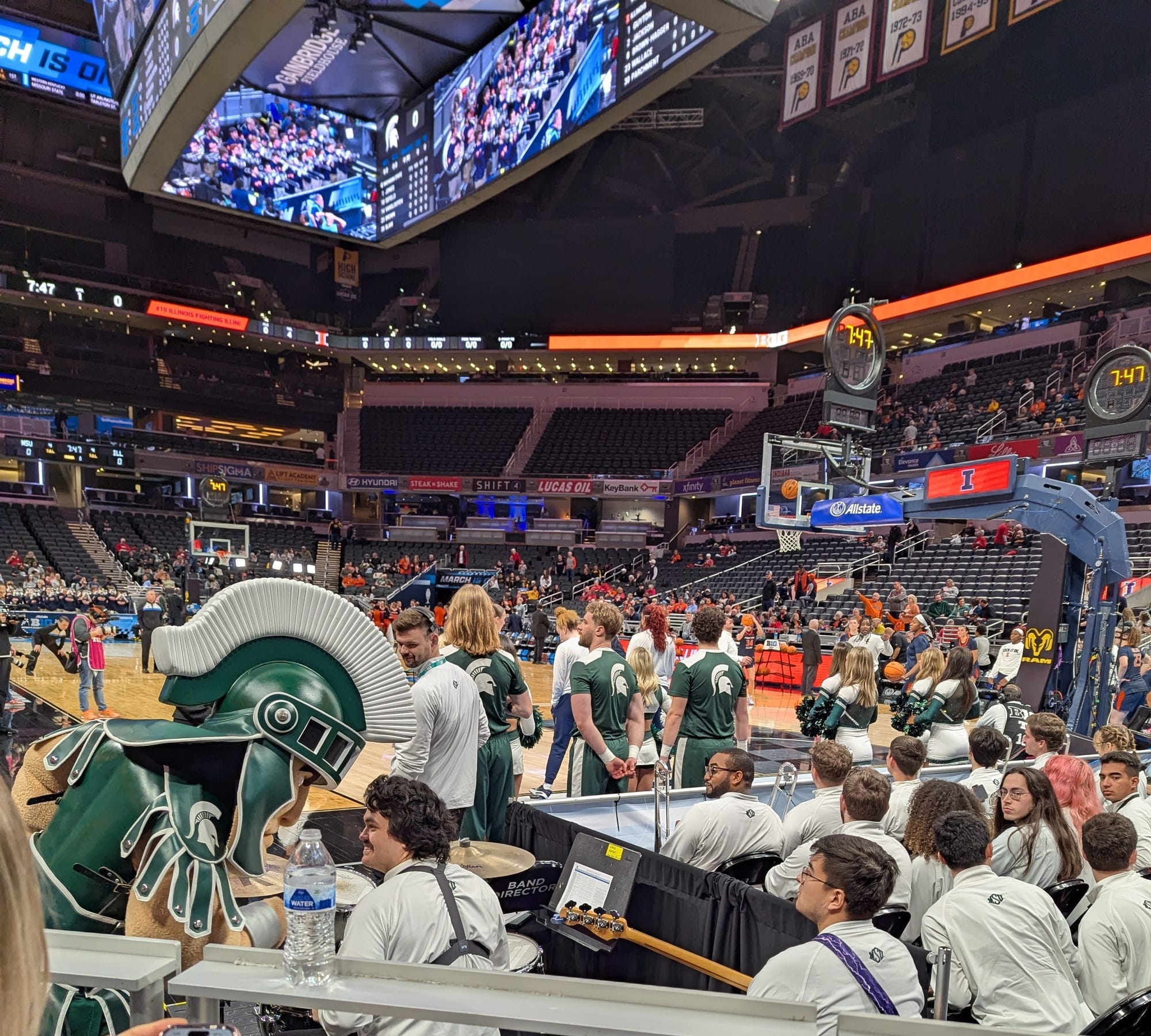 I had a breakfast meeting at work Thursday morning and honestly felt a little queasy after. I had a big beautiful omelet and it just wasn't sitting right. I chalked it up to the fact that I usually don't eat breakfast at all, and my body was just irritated with me. I felt better a few hours later so I drove east, grabbed an amazing parking spot on the street (RIGHT next to Gainbridge), and found my seat...which was in a sea of Big Ten colors. To my left, an Iowa fan; to my right, two MSU bros; in front of us, two Michigan fans. And we were all right behind the MSU band, so I did not get an unbiased perspective on the game, to say the least.